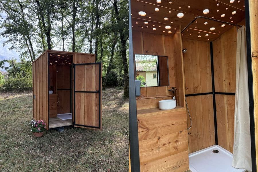 We also offer wooden shower cabins, equipped with a sink and a mirror to combine comfort and nature.